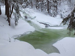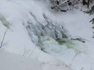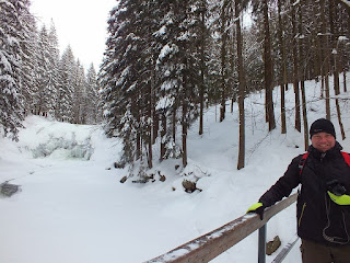 Kiedy już nasycimy oczy i aparaty cudownością jaką stworzyła natura,powolutku idziemy wydeptaną w śniegu,wąską ścieżką wzdłuż rzeki dalej.Docieramy nią nad wodospad.Kilka zdjęć z góry i brniemy po wydeptanych w białym puchu śladach.