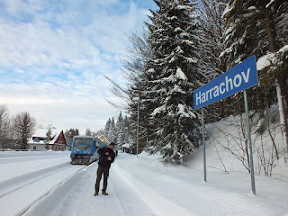 Podróż mija nam szybko.Wysiadamy w Harrachovie.Na stacji robimy sobie sesję zdjęciową i dopiero po niej postanawiamy iść do miasta.Kiedy opuszczamy stację kolejową,dostrzegamy stojący na przystanku bus jadący do dworca autobusowego,idziemy więc w jego kierunku.Wsiadamy do niego,kupujemy bilety i siadamy wygodnie.Czekamy jeszcze na przyjazd pociagu z Liberca,a kiedy przyjechał i pasażerowie się przesiedli,jedziemy.