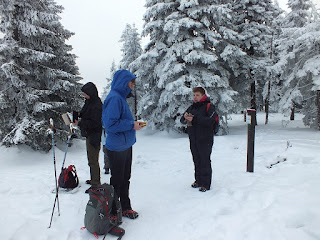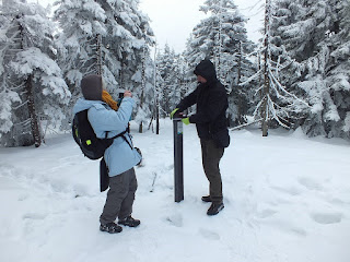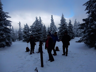 Na Czole jest słupek z dziurkaczem,nie można go nie zauważyć.Dziurkujemy więc mapki,a po dopełnieniu formalności,robimy sobie zdjęcia grupowe-dwa.Chwilę odpoczywamy,a po nabraniu oddechu i sił,powoli idziemy dalej.Przed nami Skalny Stół.