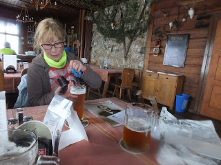 Posilamy się,odpoczywamy,rozkoszujemy smakiem piwa,rozmawiamy,robimy zdjęcia i planujemy powrotną drogę.Decydujemy się pójść żółtym szlakiem do Malej Úpy i tam poczekać na autobus jadący do Karpacza.