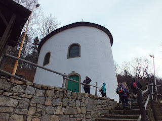 Ciut wyprzedziliśmy grupę i przy kaplicy jesteśmy pierwsi.Idziemy do Gospody po pieczątkę.Okazuje się,że są dwie-cieszy nas to niezmiernie.Stemplujemy kajety i wychodzimy na zewnątrz.Tu słuchamy opowiadania Wiktora,podziwiamy widoki i robimy zdjęcia.