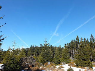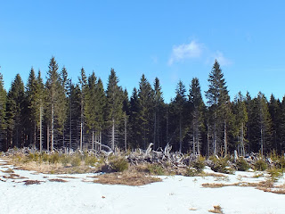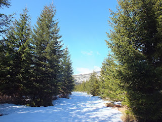 Dziś jest inaczej,śnieg stopniał,a reszta,która jeszcze zalega w zacienionych miejscach nie sprawia problemów podczas chodzenia.Wędrujemy więc leśnym duktem niespiesznie,radując się ciszą i spokojem panującym dookoła.Rozmawiamy,robimy zdjęcia i powoli docieramy na wykarczowany i zryty przez ciężkie samochody szczyt Haidy.