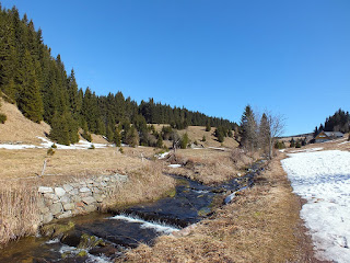 Po kilku fotkach idziemy dalej.Kiedy wychodzimy na ośnieżoną łąkę,dostrzegamy w oddali drewniany budynek-to Horská chata Haida.Pięknie się prezentuje oświetlona słońcem.Spoglądamy na nią zaciekawieni,ale nie idziemy w jej kierunku,schodzimy ku drewnianemu mostkowi.Przechodzimy przez niego i wchodzimy na łąkę,która dwa tygodnie temu był ciężka do przejścia.Nogi wtedy zapadały się w śniegu po kolana.Dziś jest inaczej.Śniegu jest niewiele,a miejscami nawet w trawie stoi woda.Wędrujemy tą łąką w kierunku drewnianej kładki i pohádkovéj stezce,którą już szliśmy dwa tygodnie temu.