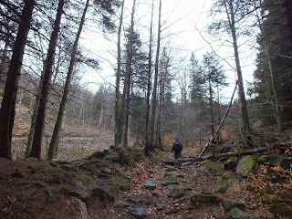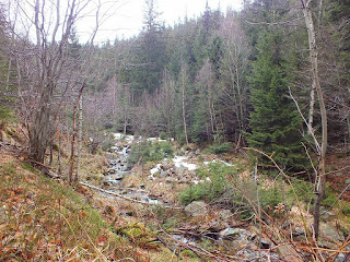Idziemy niespiesznie,cały czas pnąc się w górę.Nie pada,jest dość ciepło,tylko czasem mocno wieje wiatr.Podziwiamy przyrodę powoli budzącą się ze snu zimowego,rozmawiamy,robimy zdjęcia i docieramy do potoku Malina.Przechodzimy przez niego i idziemy wąską wydeptaną ścieżką między kamieniami.Cały czas pnąc się w górę.
