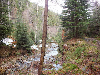 Idziemy żółtym szlakiem,który wiedzie nas wzdłuż Maliny.Mamy ją raz z lewej strony,to znów szemrze po kamieniach z prawej strony.Jej szum towarzyszy nam przez większą część naszej wędrówki do Kowar.Przy leśniczówce "Jedlinki" rozstajemy się z Wiesią i Andrzejem.Oni skręcają w lewo do Krzaczyny,a my idziemy w prawo do miasta.Drogę umilamy sobie rozmową,więc mija nam niesamowicie szybko.Kiedy docieramy do zabudowań miasta,zbaczamy na małe zakupy i dopiero po nich idziemy w kierunku stacji kolejowej