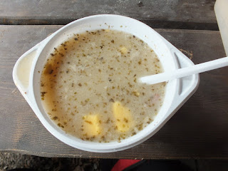 I tak przechodzimy obok ogniska,którego płomieni pilnuje Ochotnicza Straż Pożarna z Karpacza.Docieramy do dwóch kociołków-w jednym grzeje się herbata malinowa-wszak obok płynie potok Malina-w drugim natomiast wrze żurek z ziemniakami,kiełbasą i jajkami.Wszystko to zostało przygotowane przez państwa Zygfryda i Kornelię Szygula z ośrodka "U Musa" w Karpaczu,którym dzielnie towarzyszą pomocnicy-Róża i Tomek-stali bywalcy spotkań w Budnikach.Dostajemy pełne miseczki żurku,niesiemy je do stołu w wiacie,siadamy i spokojnie posilamy się.rozkoszując się smakiem i ciepłem zupy.Robię zdjęcia wiersza i piosenki o Budnikach,napisanych przez panią Jadzię.Odpoczywamy i przyglądamy się przybywającym do Budnik wędrowcom.Dostrzegamy znajome twarze,witamy się z nimi,rozmawiamy i cieszymy się ze spotkania.