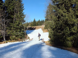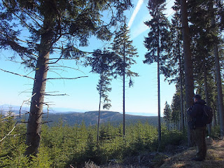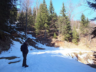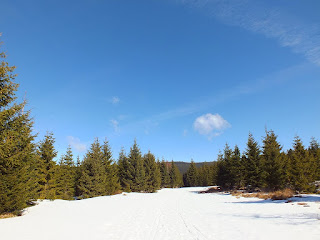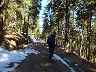 Dziś jest inaczej,śnieg stopniał,a reszta,która jeszcze zalega w zacienionych miejscach nie sprawia problemów podczas chodzenia.Wędrujemy więc leśnym duktem niespiesznie,radując się ciszą i spokojem panującym dookoła.Rozmawiamy,robimy zdjęcia i powoli docieramy na wykarczowany i zryty przez ciężkie samochody szczyt Haidy.