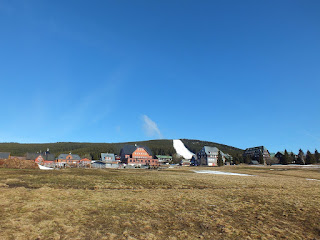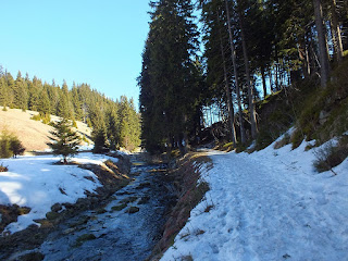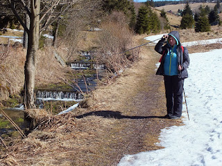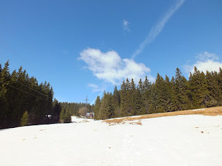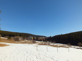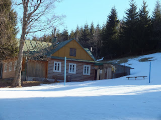 Po kilku fotkach idziemy dalej.Kiedy wychodzimy na ośnieżoną łąkę,dostrzegamy w oddali drewniany budynek-to Horská chata Haida.Pięknie się prezentuje oświetlona słońcem.Spoglądamy na nią zaciekawieni,ale nie idziemy w jej kierunku,schodzimy ku drewnianemu mostkowi.Przechodzimy przez niego i wchodzimy na łąkę,która dwa tygodnie temu był ciężka do przejścia.Nogi wtedy zapadały się w śniegu po kolana.Dziś jest inaczej.Śniegu jest niewiele,a miejscami nawet w trawie stoi woda.Wędrujemy tą łąką w kierunku drewnianej kładki i pohádkovéj stezce,którą już szliśmy dwa tygodnie temu.