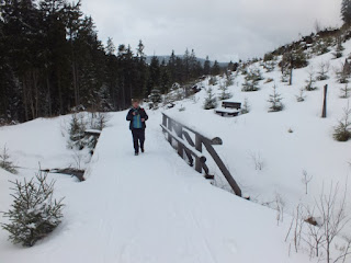 Według mapy,chcąc wejść na Haide powinniśmy wrócić do mostku,przy którym wcześniej Radek mówił,że jeśli przez niego przejdziemy,to najprawdopodobniej dotrzemy do Haidy.Wracamy więc.Przechodzimy przez stok narciarski z wyciągiem orczykowym i docieramy do owego mostku.Spoglądamy na siebie przez chwilę i przechodzimy na drugą stronę.Wspinamy się ku białej łące.Szlak jest ubity przez niewielki ratraczek,widać na nim ślady butów,więc idziemy.Najpierw dość dobrze nam się idzie,ale gdy jesteśmy na środku łąki,nasze nogi zaczynają się zapadać po kolana.Oj ciężko jest tak iść,a jeszcze na dokładkę zrobiłam się głodna.Jestem zmęczona i burczy mi w brzuchu.Radek widząc moją minę-muszę kiepsko wyglądać-stwierdza,że Haide możemy sobie odpuścić dzisiaj.Skoro miał być delikatny spacer,to na dziś wystarczy.Jestem Mu wdzięczna za to :) Idziemy przez las,kierując się ku Pomeznim Boudom.