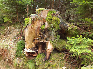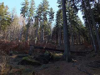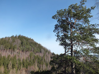 Leśna droga prowadzi nas przez szosę i parking u podnóża "Szwajcarki",wprowadzając nas w las.Znamy te lesne ostępy-przyjeżdżaliśmy tu z Tatkiem na grzyby.Dziś jednak Tatko nie poznał by tego lasu.Wycinka drzew niesamowicie go zmieniła....