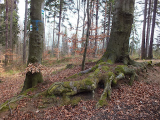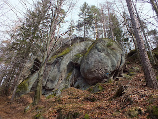 Zielony szlak wiedzie nas kawałek asfaltową drogą.Przy wiacie odpoczynkowej skręca jednak w prawo na pnący się ku górze leśny dukt.Wędrujemy nim,wspinając się wyżej i wyżej...Leśna droga wije się między nagimi bukami i skalnymi formami.Im jesteśmy wyżej,tym skalne ściany są większe,wyższe i bardziej przyciągają nasz wzrok.Przystajemy na sesje zdjęciowe,a po nich powoli idziemy dalej i tak docieramy do Zamku Bolczów.