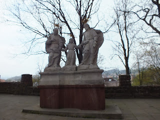 Stajemy na wprost Mariańskiego Słupa.Jest ogrodzony,trwają przy nim prace remontowe.Szkoda że nie jest nam dane widzieć go w pełnej krasie.