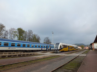 Podróż mija nam szybko i bezproblemowo.Wysiadamy na stacji Trutnov hlavní nádraží.Wchodzimy do budynku dworcowego.tylko po to by wyjść z drugiej strony i iść do miasta,ale kiedy na wyświetlaczu dostrzegam że za 6 minut odjedzie pociąg jadący przez Jaroměř,Radek zmienia plan.Idzie do kasy i kupuje dwa bilety do Jaroměřa.Wychodzimy na peron i wsiadamy do stojącego na torze pociągu.Rozsiadamy się wygodnie i o 9:42 odjeżdżamy.
