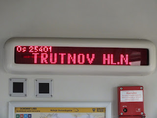 Kiedy docieramy do dworca kolejowego,okazuje się,że pociąg jadący do Trutnova ma opóźnienie 5 minut.Kupujemy więc bilety-Pani w kasie zdziwiona i zaskoczona sprzedała nam je,ale najpierw spojrzała na wyświetlacz,gdzie wciąż pociąg do Trutnova się znajduje.Idziemy na peron.Gdy przyjeżdża nasz pociąg,wsiadamy do niego i zajmujemy wygodne miejsca.