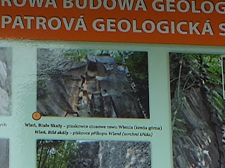 I kiedy tak wędrujemy,nagle przed nami wyrastają skały.Skryte w ciemnym lesie,zasłonięte drzewami.Jedynie wąska,wydeptana ścieżka świadczy że można do nich dojść.Idziemy więc w ich kierunku.Z prawej strony dostrzegamy tablicę informacyjną-jest zasłonięta przez drzewa,więc jej nie widać.Podchodzimy bliżej i dociera do nas że stoimy pod Białymi Skałami.Robimy zdjęcia,oglądamy i stwierdzamy że miejsce to pozostawiono samemu sobie.Gdyby wycięto krzaki i drzewa ,oczyszczono teren i dobrze oznakowano,to pewnie sporo osób by tu zaczęło przychodzić.
