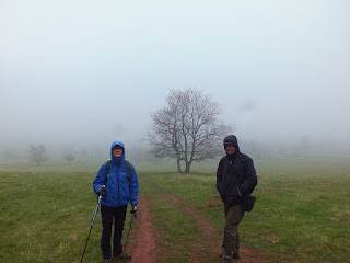 Co jakiś czas z lewej strony wyłaniają się widoki,Są zamglone,ale wyobraźnia podpowiada,że gdy jest piękna pogoda,to muszą być cudne.Wędrujemy błotnistą drogą.Buty i nogawki spodni mamy oblepione czerwoną ziemią,mokra mgła otacza nas z każdej strony,chytrze skrywając przed nami krajobrazy.Idziemy dość szybkim tempem,zależy nam by nie moknąć,bo co jakiś czas niestety trochę popaduje....