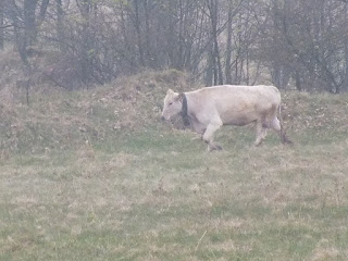 Wedrujemy błotnistą drogą między polami na których pasą się gdzieniegdzie krowy.Niektóre pola są otoczone pastuchami,więc by iść dalej trzeba pod nimi przejść.Jednak gdy docieramy do pozostałości kapliczki pod dużym drzewem,szlak już wiedzie dobrze oznaczoną drogą,wijącą się między polami.