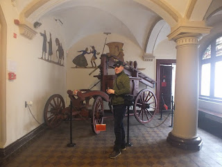 Pierwsze zdjęcia robimy już holu-stoi tu stary wóz strażacki,a na ścianach wymalowane są scenki z życia dawnych Ziębiczan.Pani prowadzi nas i małżeństwo z dzieckiem do piwnic.